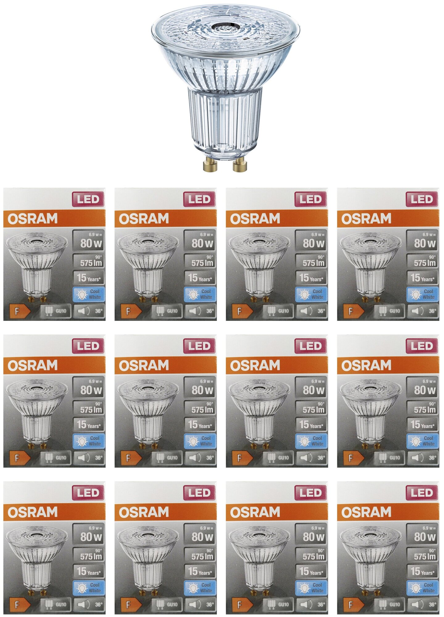 Лампочки 12шт/уп. Лампа LED Софит 6.9Вт 220-240V GU10 PAR16 575Лм 4000К Угол 36 град. D-51mm L-55mm Свет Дневной белый OSRAM, уп. 12шт