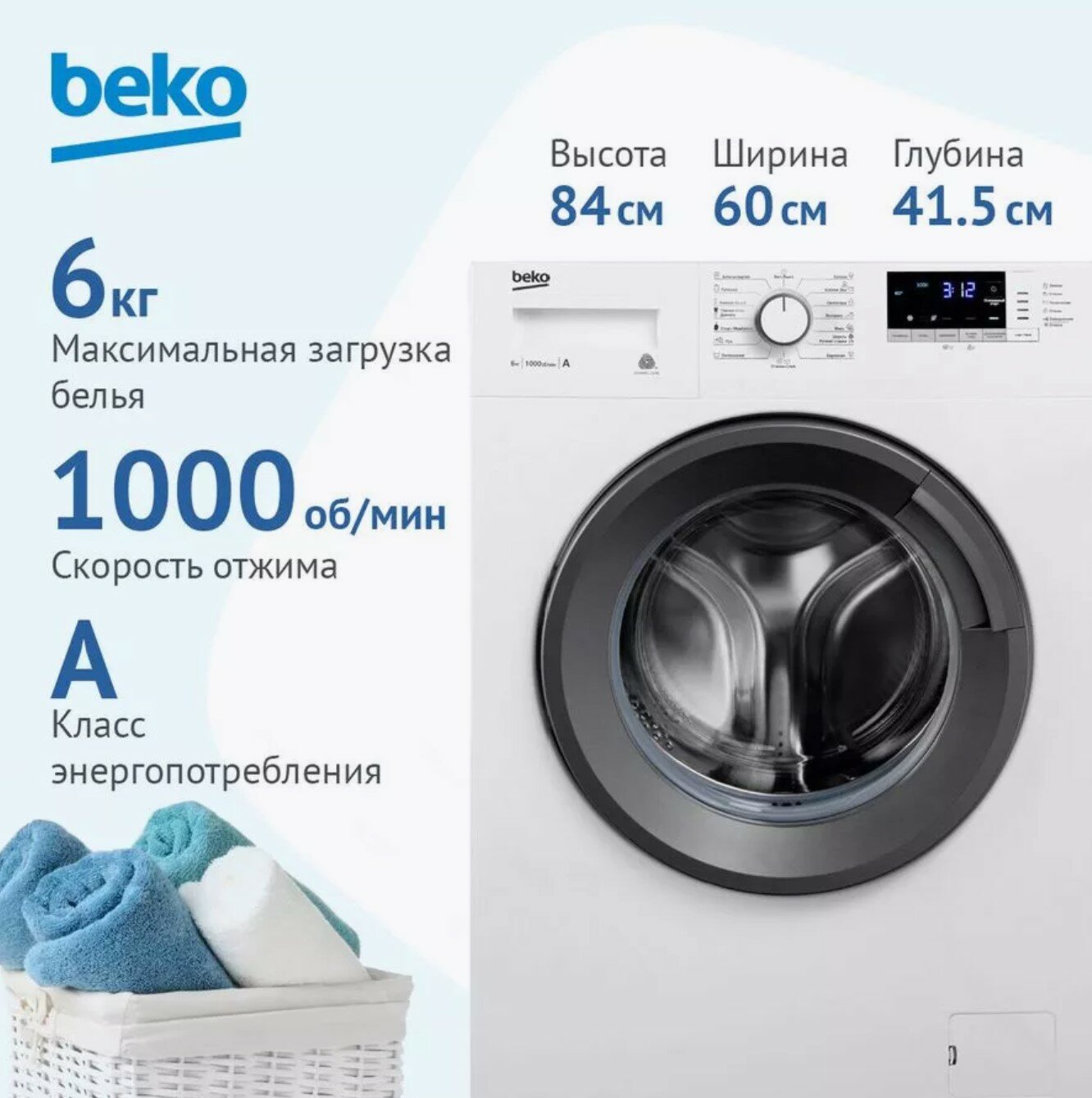 Стиральная машина Beko WRE6512ZAW, с фронтальной загрузкой, 6кг, 1000об/мин