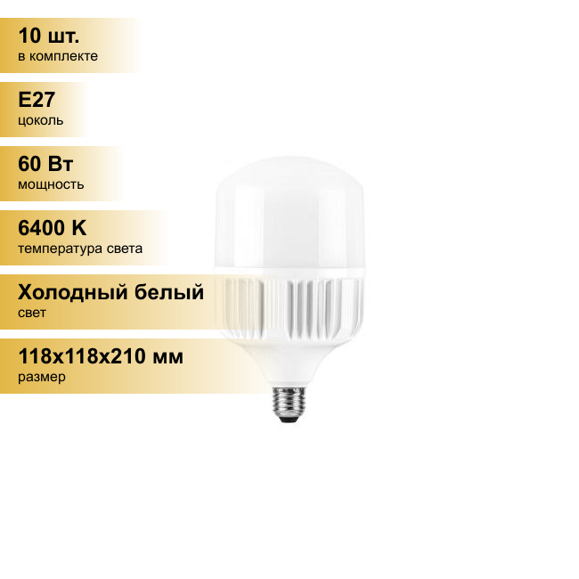 Лампочки (10 шт.) Светодиодная лампочка Feron лампа св/д высокомощн. E27-E40 60W(5700lm) 6400K 6K 210х118 LB-65 25782 Холодный белый. Цоколь E27