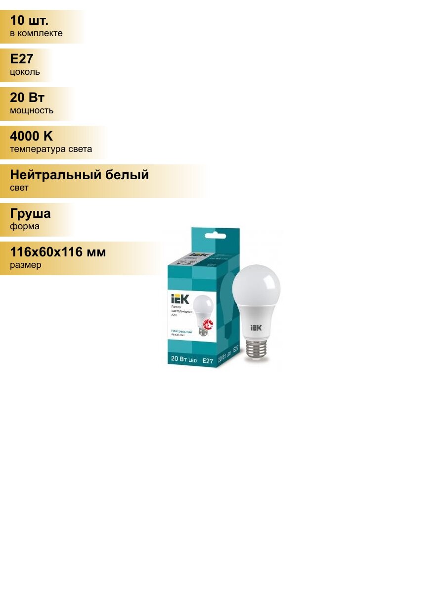 Лампочки (10 шт.) Светодиодная лампочка IEK ЛОН A60 E27 20W(1800lm) 4000K 4K 116x60 ECO LLE-A60-20-230-40-E27 Нейтральный белый. Цоколь E27