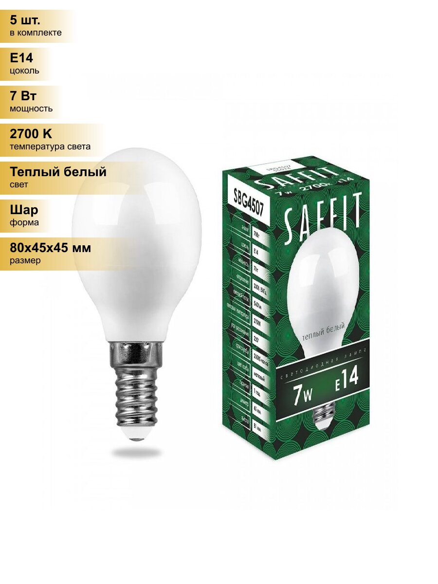 Лампочки (5 шт.) Светодиодная лампочка Saffit шар G45 E14 7W(560Lm) 2700K 2K матовая 80x45 SBG4507 55034 Теплый белый. Цоколь E14