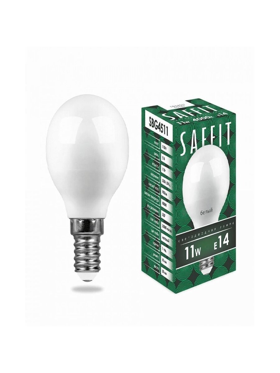 Лампочки (15 шт.) Светодиодная лампочка Saffit шар G45 E14 11W(905lm) 4000K 4K матовая, пластик 80x45 SBG4511 55138 Нейтральный белый. Цоколь E14