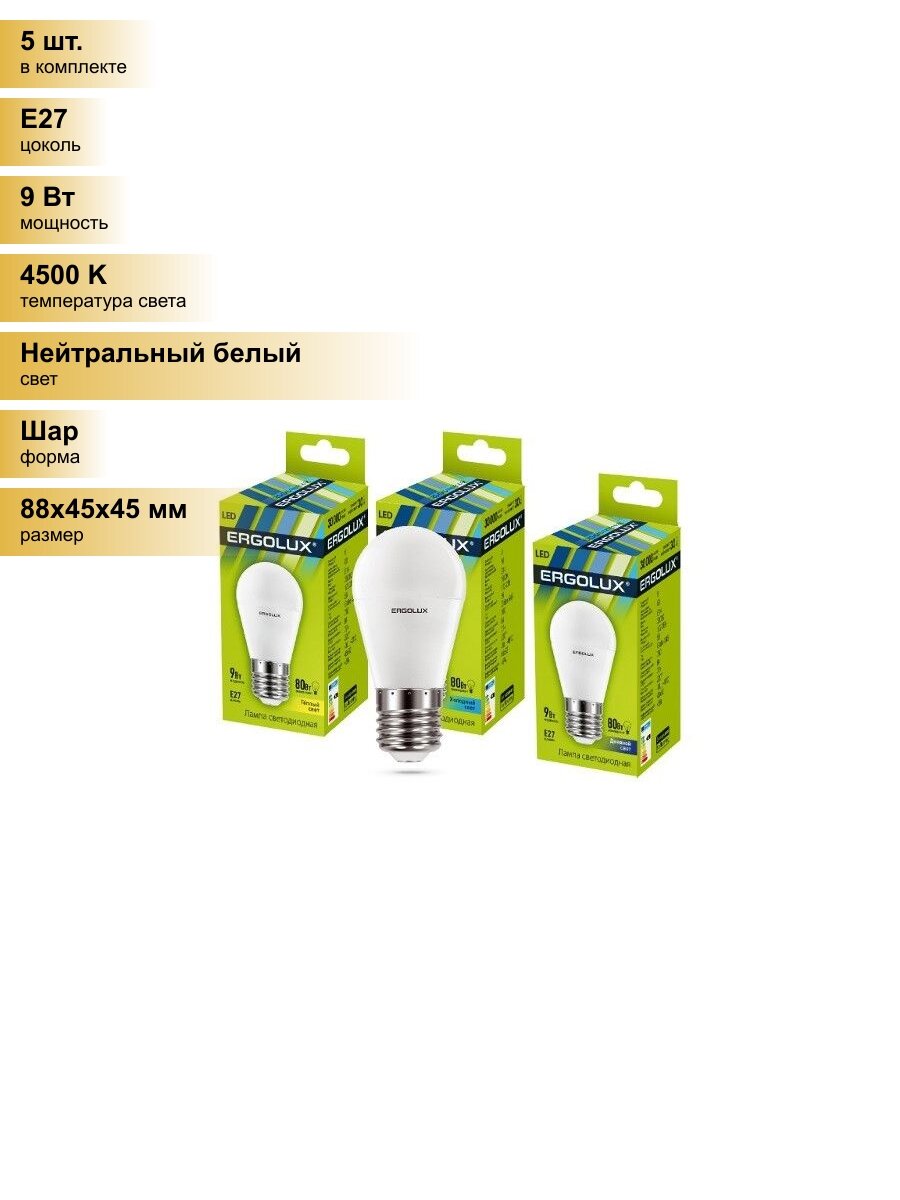 Лампочки (5 шт.) Светодиодная лампочка Ergolux шар G45 E27 9W(780lm 220°) 4500K 4K матовая 88x45 пластик/алюм. LED-G45-9W-E27-4K Нейтральный белый. Цоколь E27