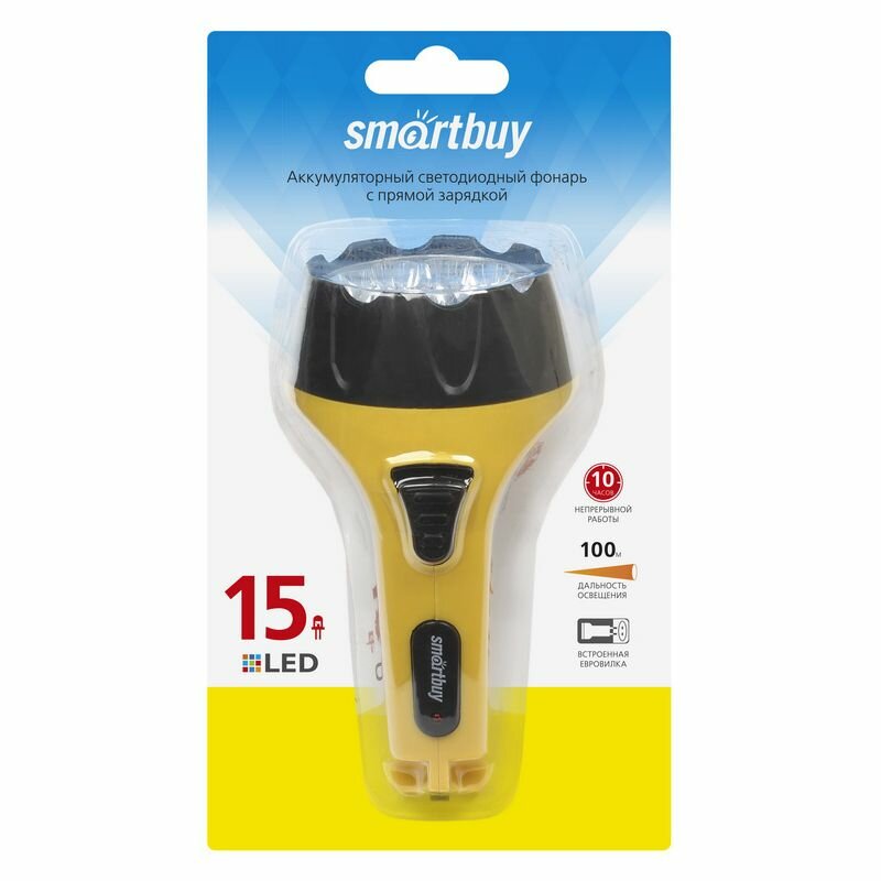 Фонарь ручной SmartBuy аккумуляторный, светодиодный, 15 LED, прямая зарядка от сети, желтый SBF-85-Y