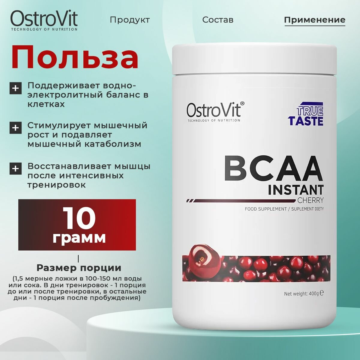 Аминокислоты Ostrovit Instant, BCAA 2:1:1, порошок 400г со вкусом вишни / Комплекс аминокислот для набора мышечной массы, для похудения