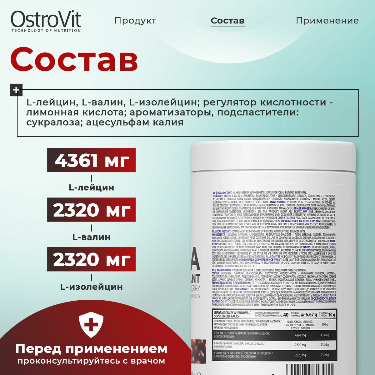 Источник аминокислот с разветвленной цепью BCAA 2:1:1 400 гр (OstroVit) Без вкуса 3 560 ₽ Подробнее