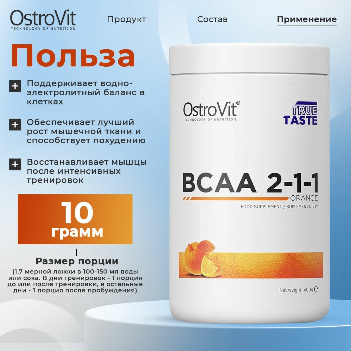 Аминокислоты Ostrovit, BCAA 2:1:1, Спортивное питание, Аминокислоты для набора мышечной массы и похудения, порошок 400г со вкусом апельсина