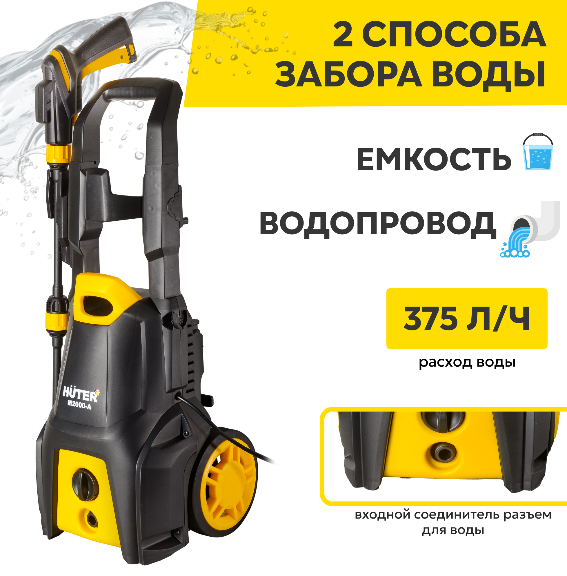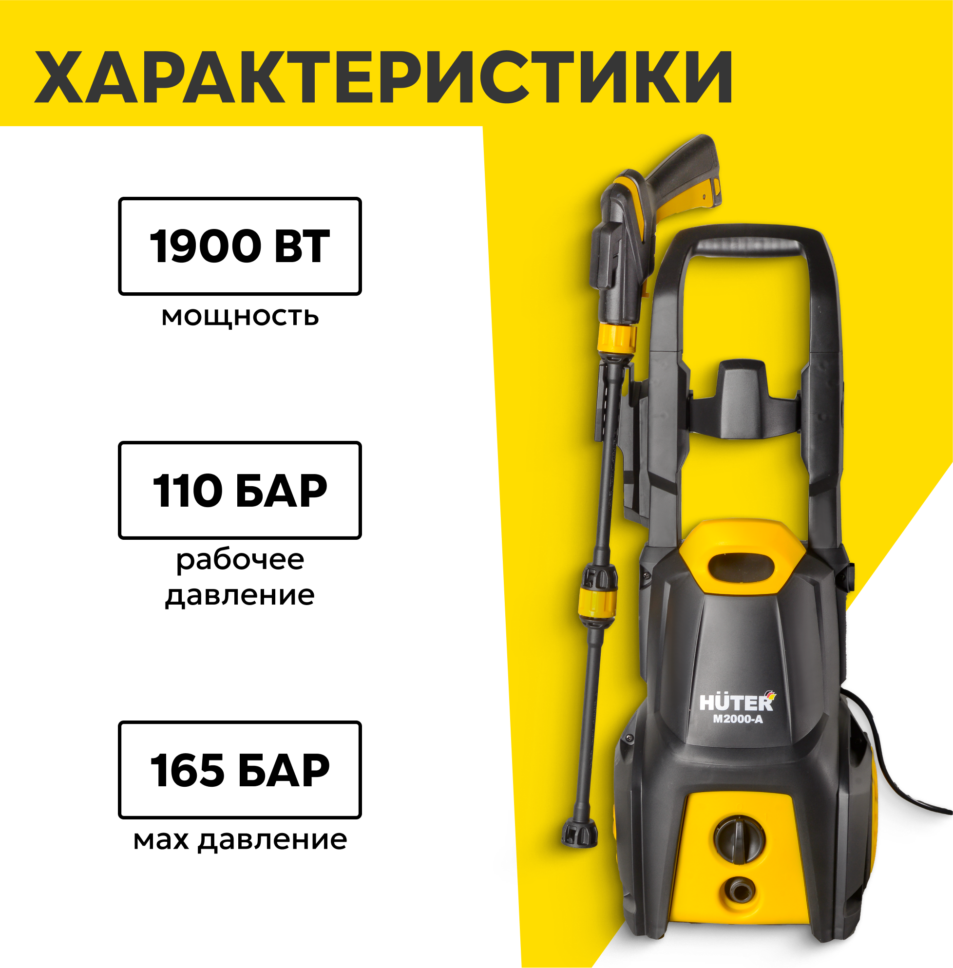 Мойки высокого давления Мойка высокого давления Huter M2000-A, 1900 Вт, 165 Бар, 375 л/ч, шланг – 5 м, подача воды: водопровод/емкость