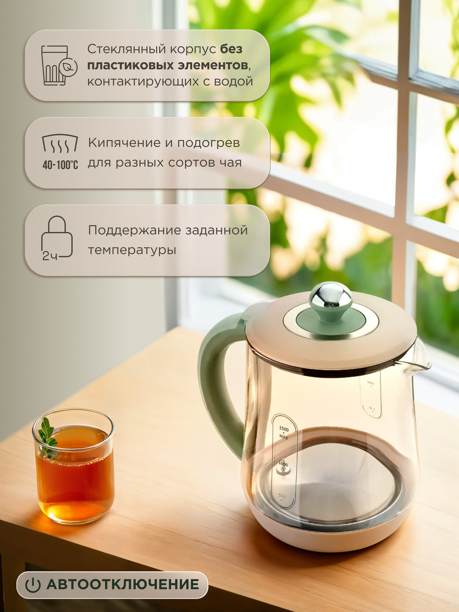 Электрический чайник BRAYER BR1015 2200 Вт, 1,5 л, подставка, подогрев 40-100 °С, заваривание чая, стекло