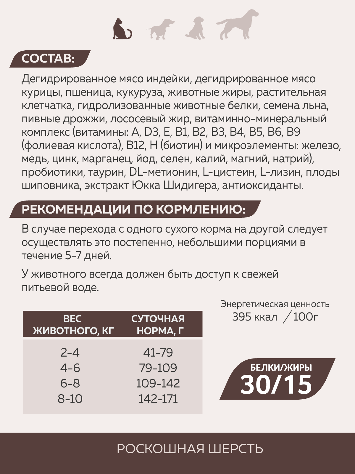 | Назначение | для кожи и шерсти, полноценное и сбалансированное питание |