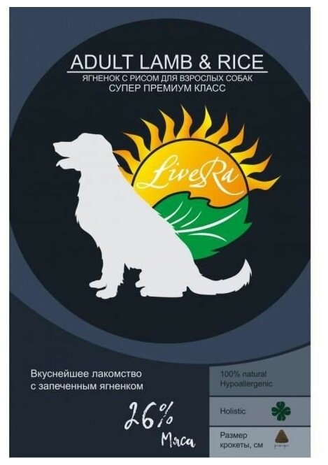 LiveRa Полнорационный сухой корм для взрослых собак Lamb & Rice, 15 кг - вкус ягнёнок с рисом
