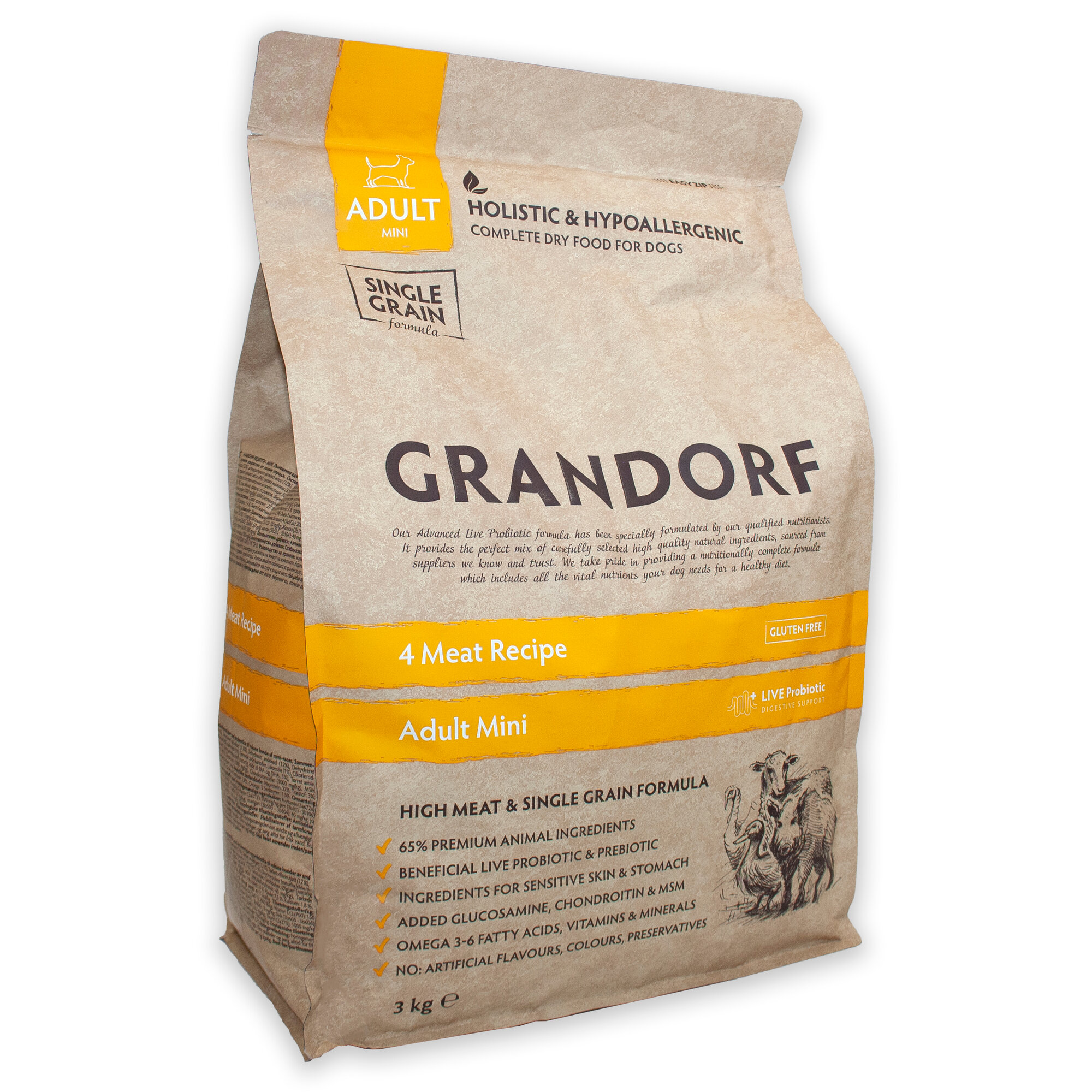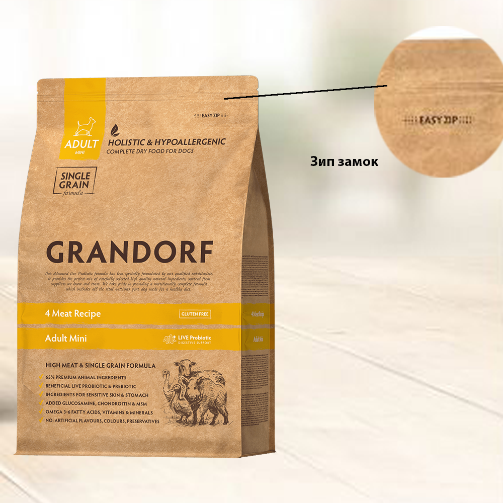 Корм GRANDORF 4 Мяса Мини 1 кг. Для собак мини пород от 1 года. С пробиотиками, гипоаллергенный.