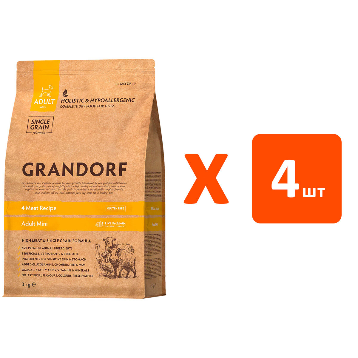Корм для собак GRANDORF SINGLE GRAIN DOG ADULT MINI 4 MEAT RECIPE низкозерновой для собак маленьких пород 4 вида мяса с ягненком, индейкой, уткой и кабаном 3кг х 4шт