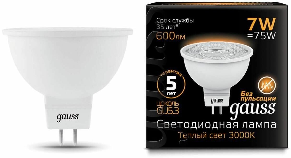 Лампа Gauss MR16 7W 600lm 3000K GU5.3 LED 101505107 (10 шт)