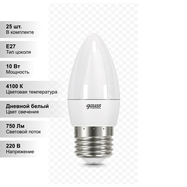 Лампочки (25 шт.) Светодиодная лампочка Gauss С37 10Вт 220В 4100K E27