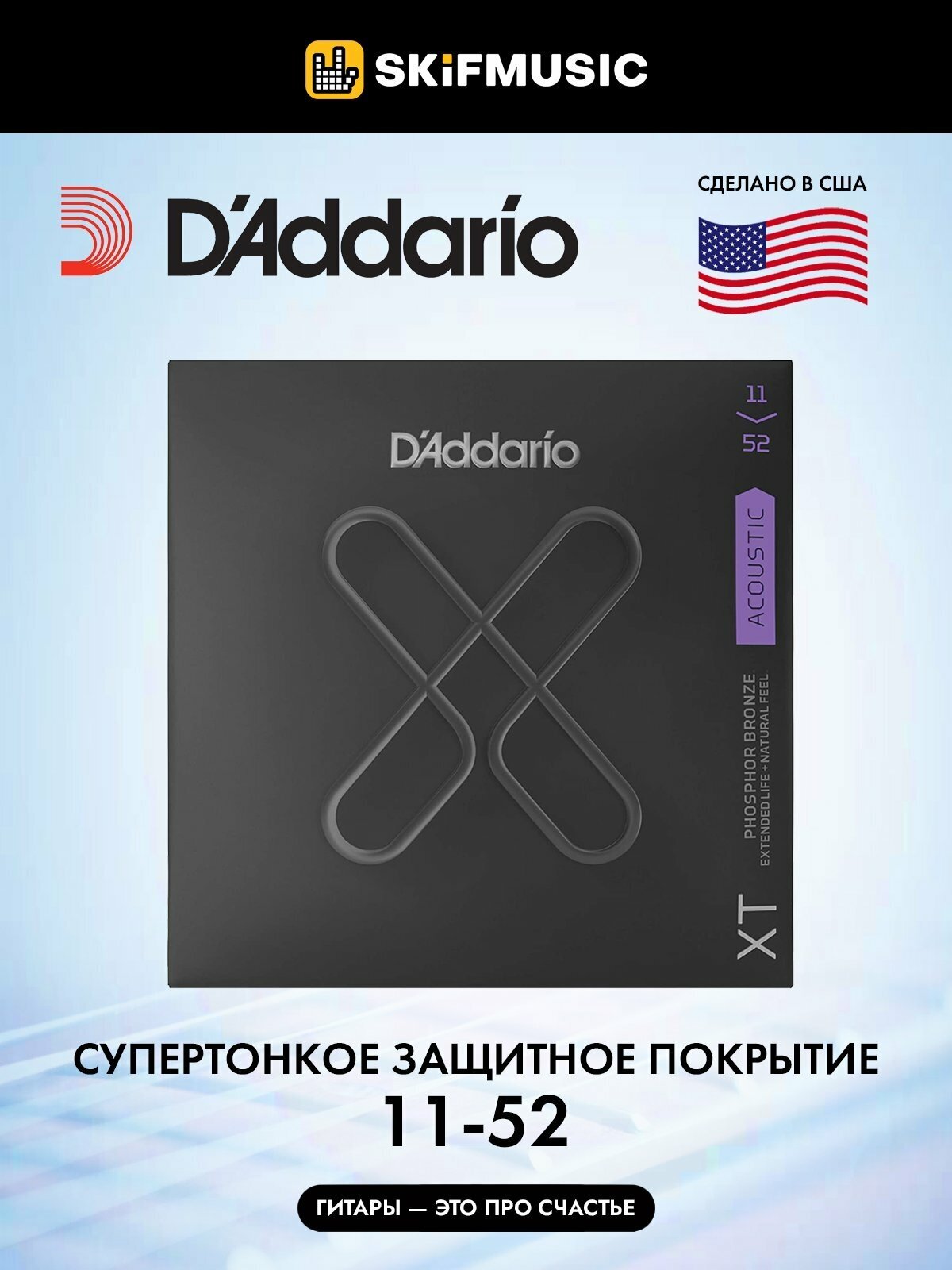 Струны XTAPB1152 XT Комплект струн для акустической гитары, фосф. бронза, 11-52, с покрытием, D'Addario
