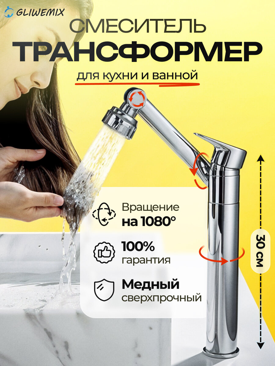 Смеситель для кухни, раковины, умывальника, ванной, мойки Gliwemix поворотный с вращением на 360 градусов и аэратором. Кран для ванны и душа. Высокий 4 910 ₽ Подробнее