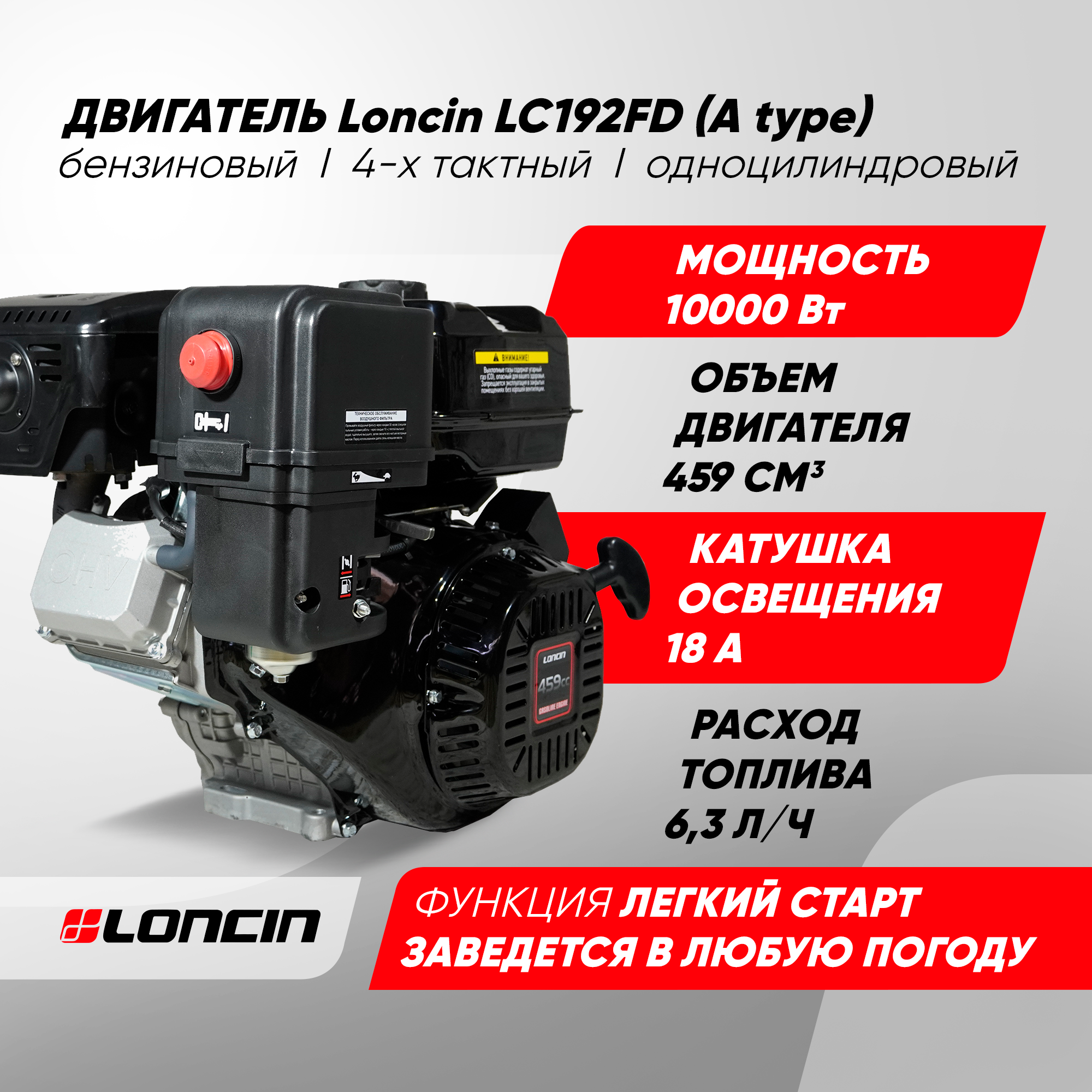 Двигатели Двигатель бензиновый Loncin LC192FD (A type) D25 18А (20л. с, 459 куб. см, вал 25мм, ручной и электрический старт, катушка 18А)