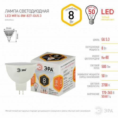 (20 шт.) Светодиодная лампочка ЭРА стандарт MR16 GU5.3 220V 6W(500lm) 2700K 2K 50x50 MR16-6w-827-GU5.3 6131 Теплый белый. Цоколь GU5.3 3 306 ₽ Подробнее