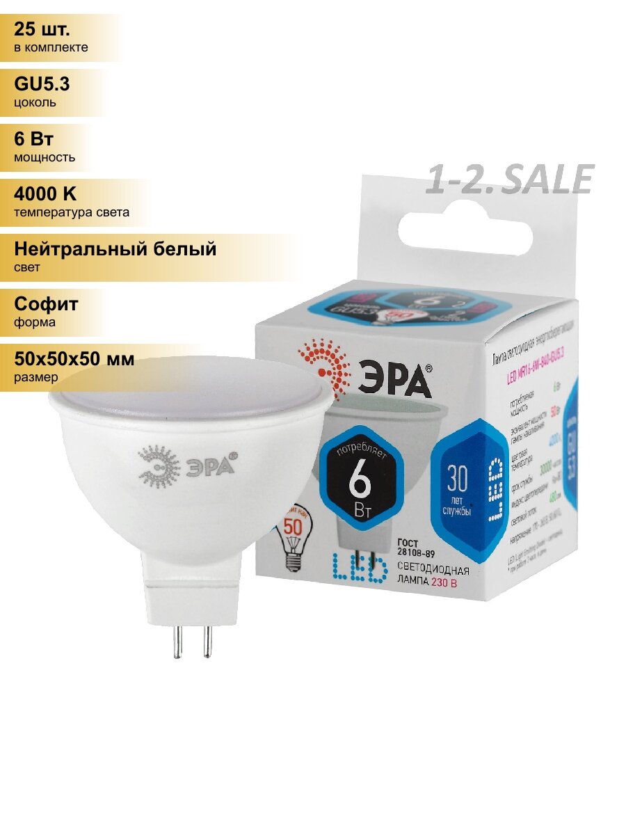 Лампочки (25 шт.) Светодиодная лампочка ЭРА стандарт MR16 GU5.3 220V 6W(500lm) 4000K 4K 50x50 MR16-6w-840-GU5.3 6162 Нейтральный белый. Цоколь GU5.3