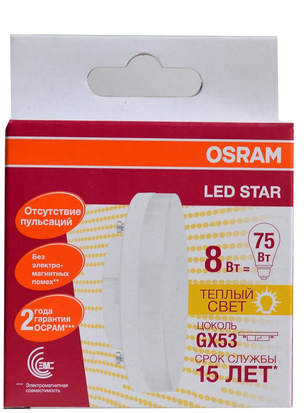 Лампочки 10шт/уп. Лампа LED Таблетка 8Вт 220-240V GX53 800Лм 2700К Угол 110 град. D-75mm L-22mm Свет Теплый белый OSRAM, уп. 10шт