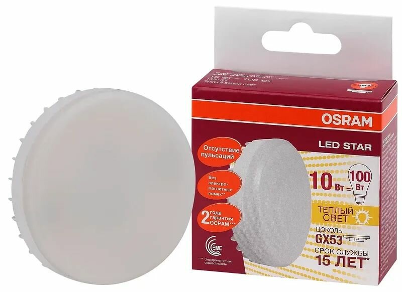 10шт/уп. Лампа LED Таблетка 10Вт 220-240V GX53 1000Лм 2700К Угол 120 град. D-75mm L-24mm Свет Теплый белый OSRAM, уп. 10шт