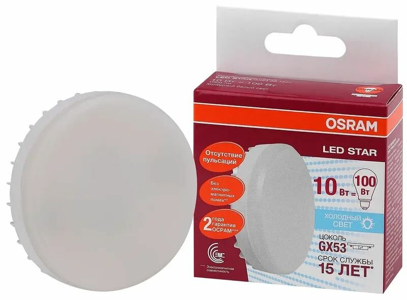 10шт/уп. Лампа LED Таблетка 10Вт 220-240V GX53 1000Лм 4000К Угол 110 град. D-75mm L-24mm Свет Дневной белый OSRAM, уп. 10шт
