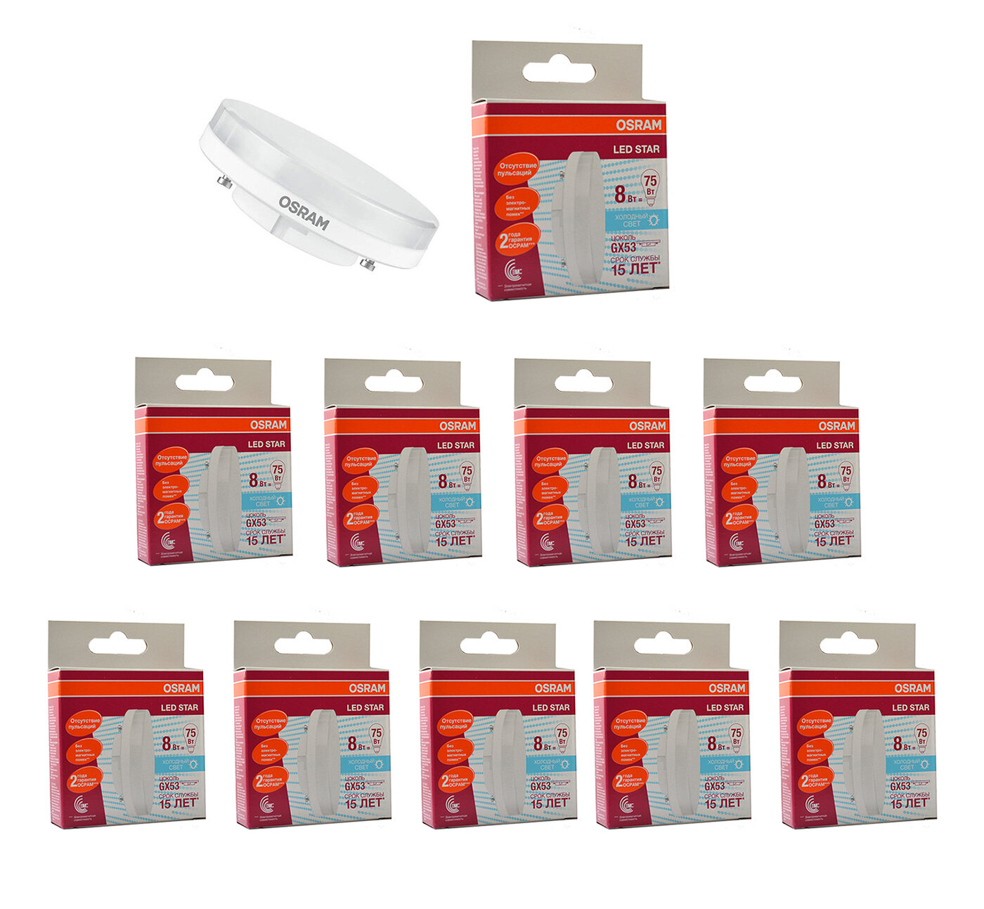10шт/уп. Лампа LED Таблетка 10Вт 220-240V GX53 1000Лм 2700К Угол 120 град. D-75mm L-24mm Свет Теплый белый OSRAM, уп. 10шт