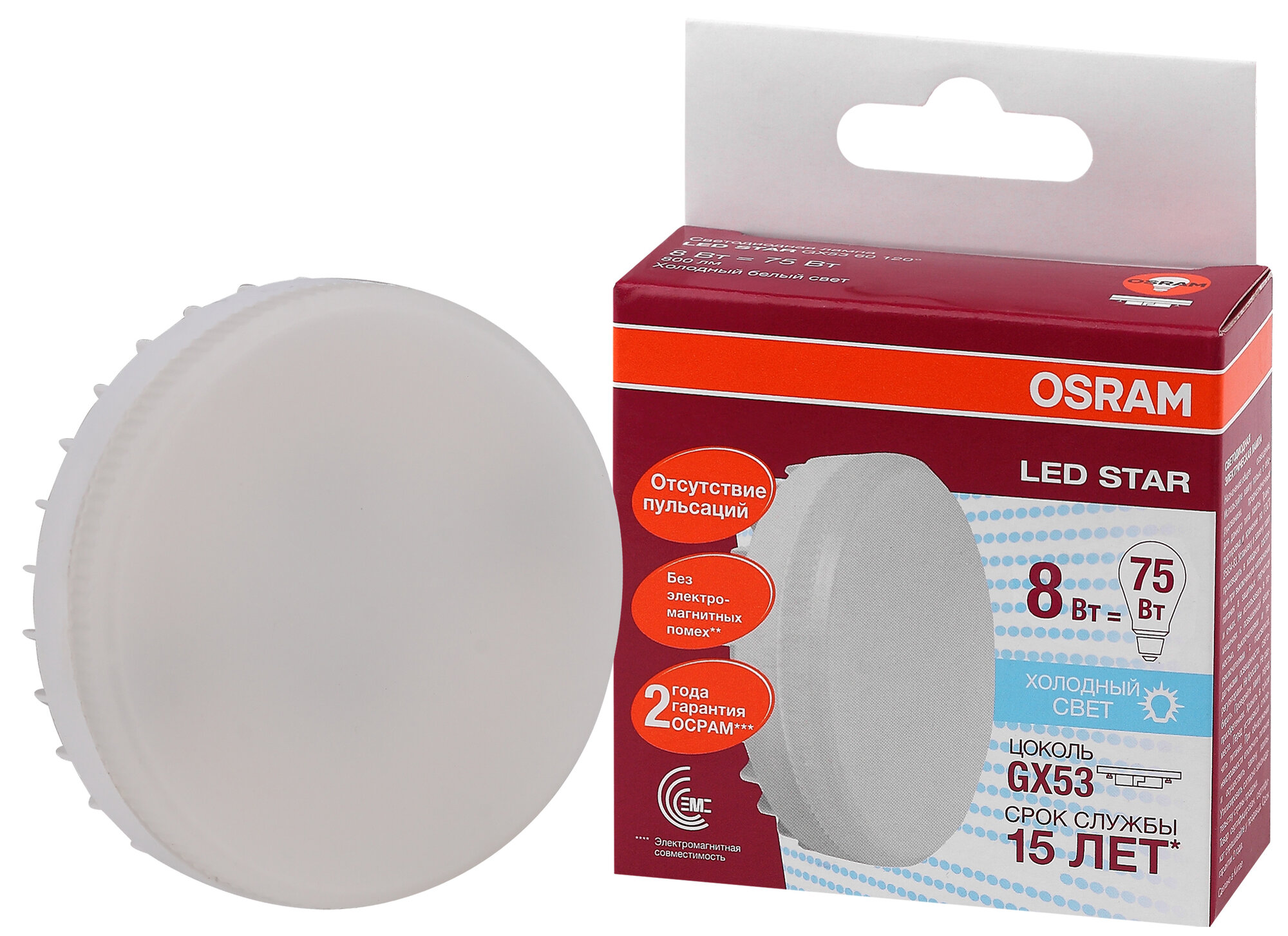10шт/уп. Лампа LED Таблетка 8Вт 220-240V GX53 800Лм 2700К Угол 110 град. D-75mm L-22mm Свет Теплый белый OSRAM, уп. 10шт
