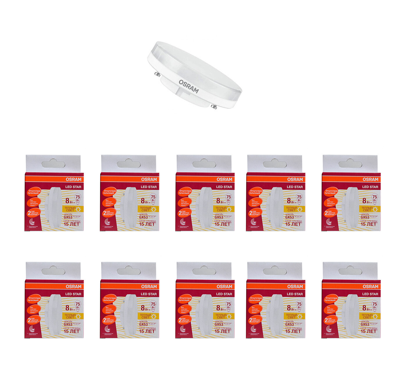 10шт/уп. Лампа LED Таблетка 8Вт 220-240V GX53 800Лм 2700К Угол 110 град. D-75mm L-22mm Свет Теплый белый OSRAM, уп. 10шт