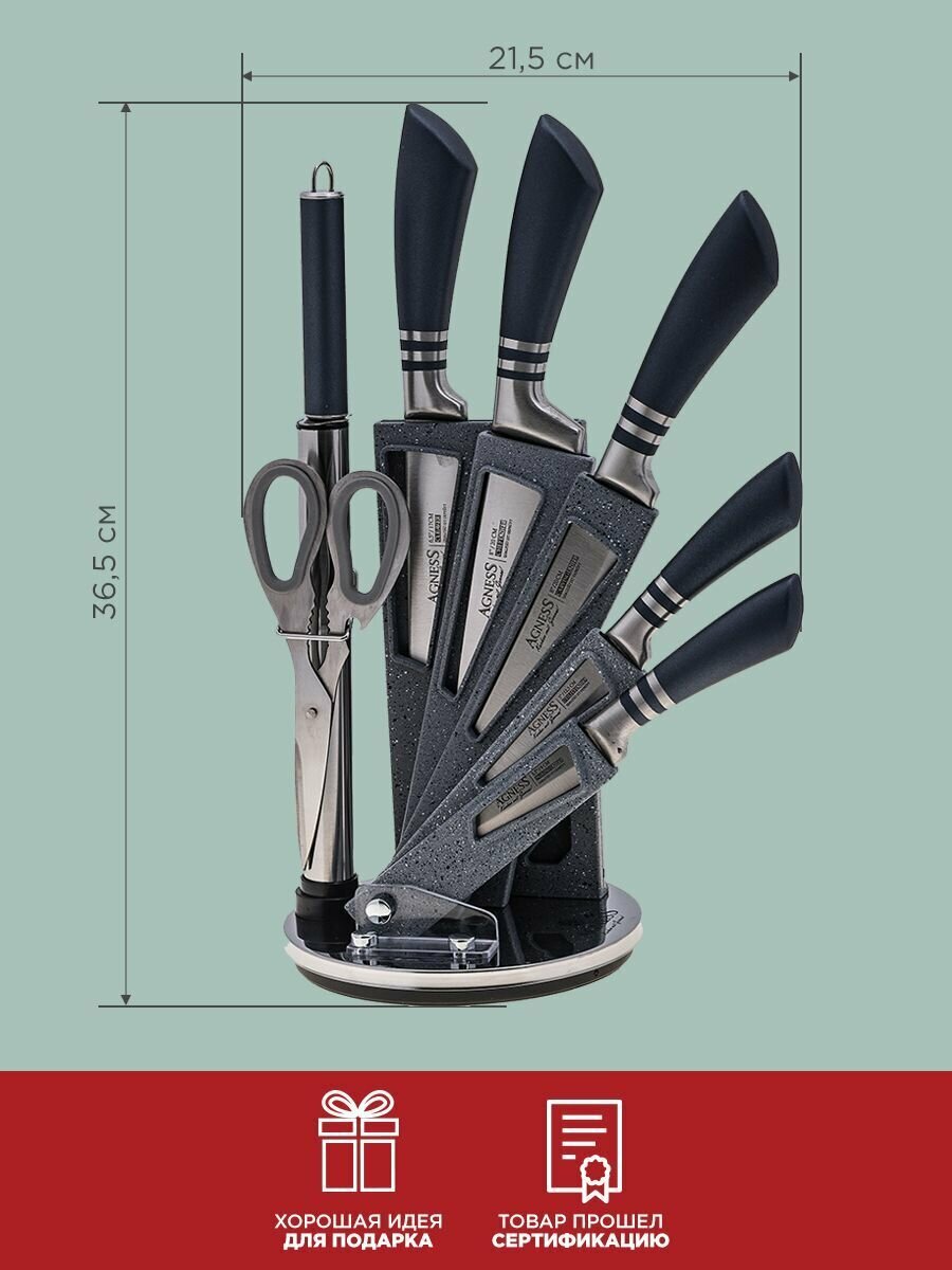 Набор ножей Agness с ножницами и мусатом на вращающейся платиковой подставке, 8 предметов