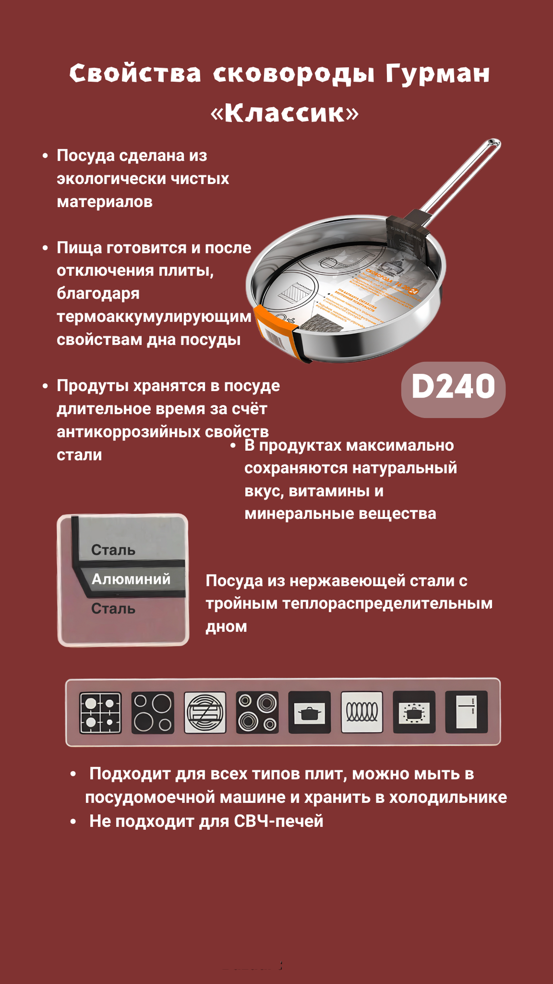 Сковорода 24см гурман Классик из нержавеющей стали 18/10 (AISI 304) ВСМПО салда для индукции