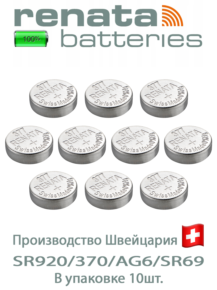 Батарейка Renata 377 10шт/Элемент питания рената 377 В10 (SR626SW)(без ртути) 10шт