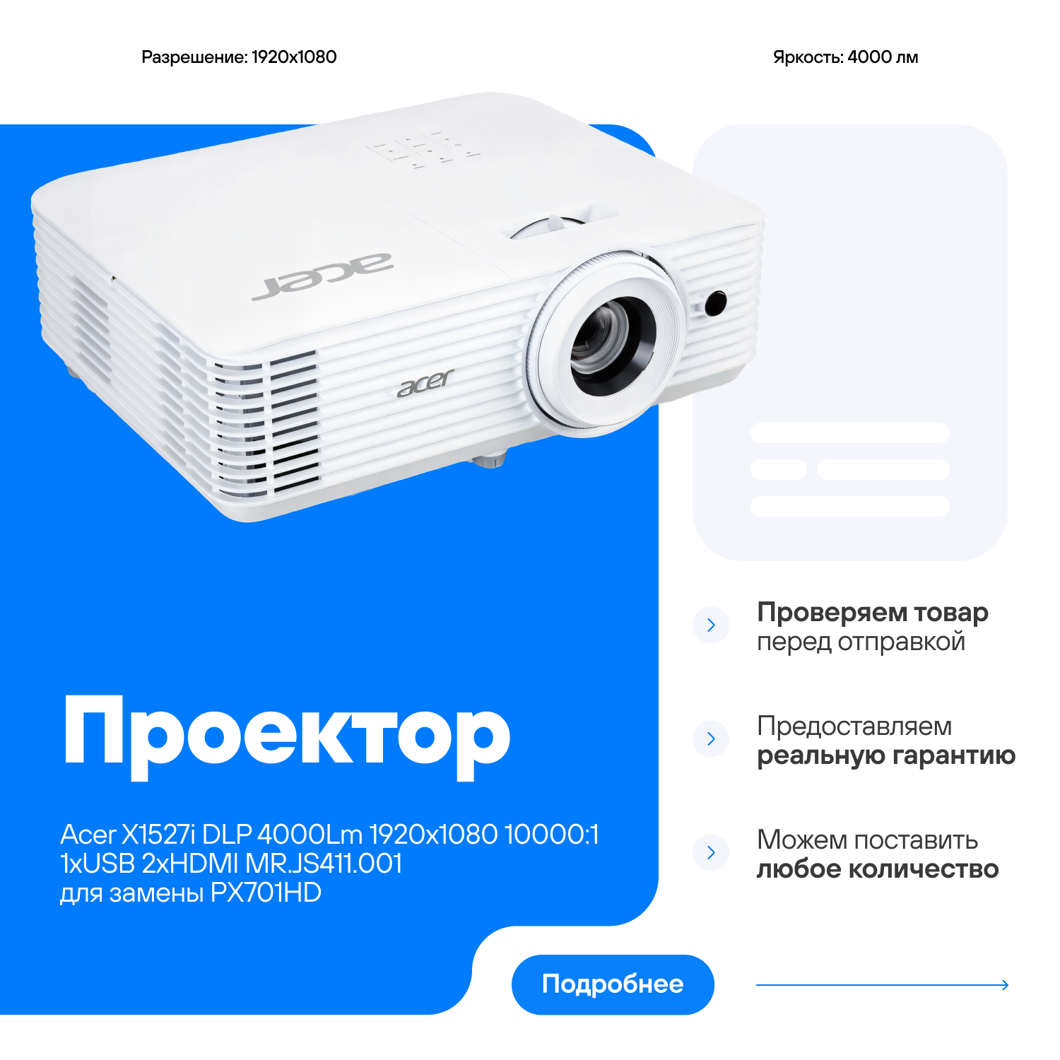 Проекторы Проектор Acer X1527i DLP 4000Lm 1920x1080 10000:1 1xUSB 2xHDMI MR. JS411.001 совместим для замены с PX701HD