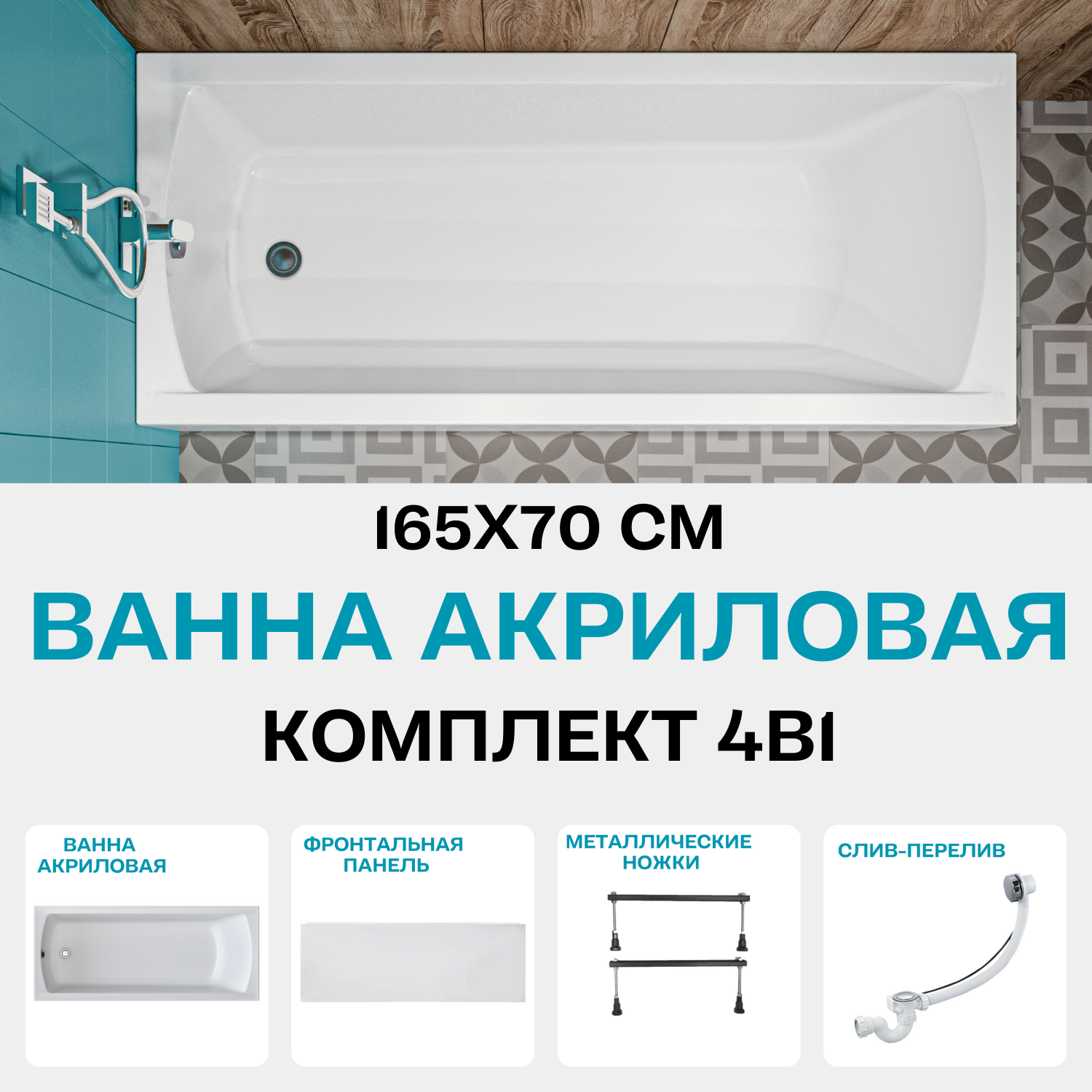 Ванна Ванна акриловая 165х70 см 1MARKA MODERN в наборе 4 в 1: Прямоугольная ванна, фронтальная панель, металлические ножки, слив-перелив хром 01мод16570кс1+