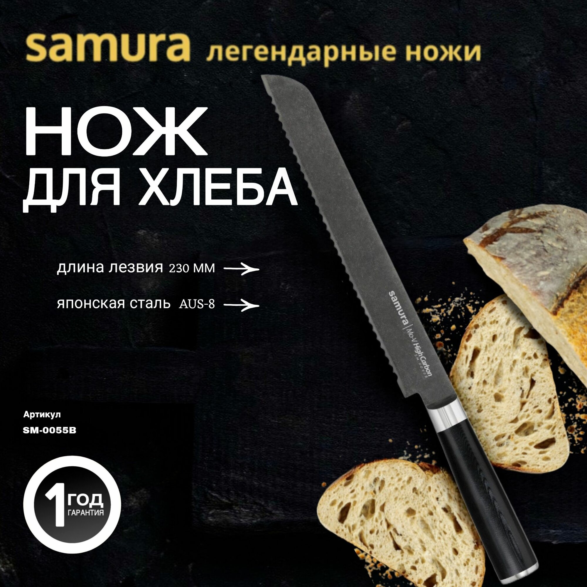 Кухонные ножи Нож кухонный для хлеба Samura Mo-V Stonewash SM-0055B, 23 см, черный