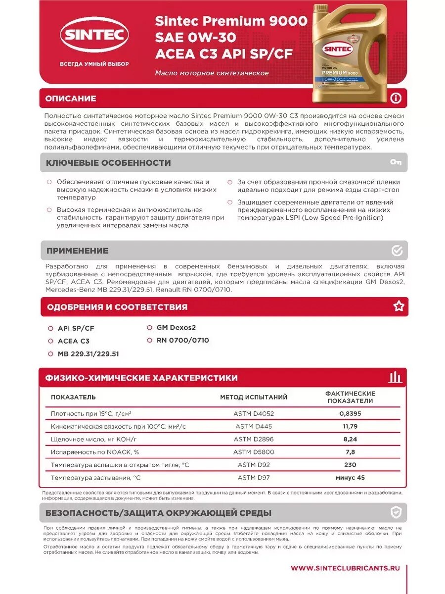 | Соответствие стандартам | API SN; ACEA C2/C3 |