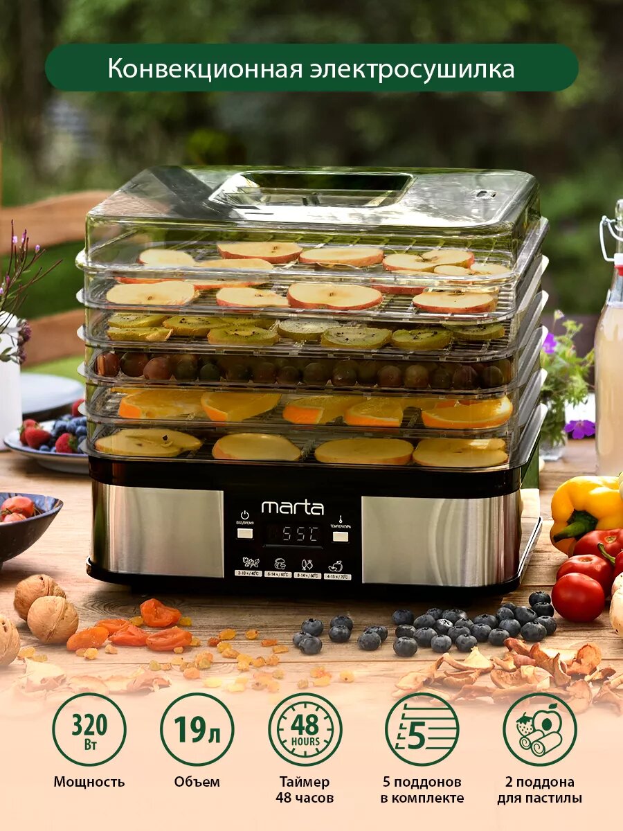 Сушилки фруктов Дегидратор сушилка для овощей электросушилка MARTA MT-FD1887E 7 поддонов (5 основных + 2 для пастилы) черный жемчуг