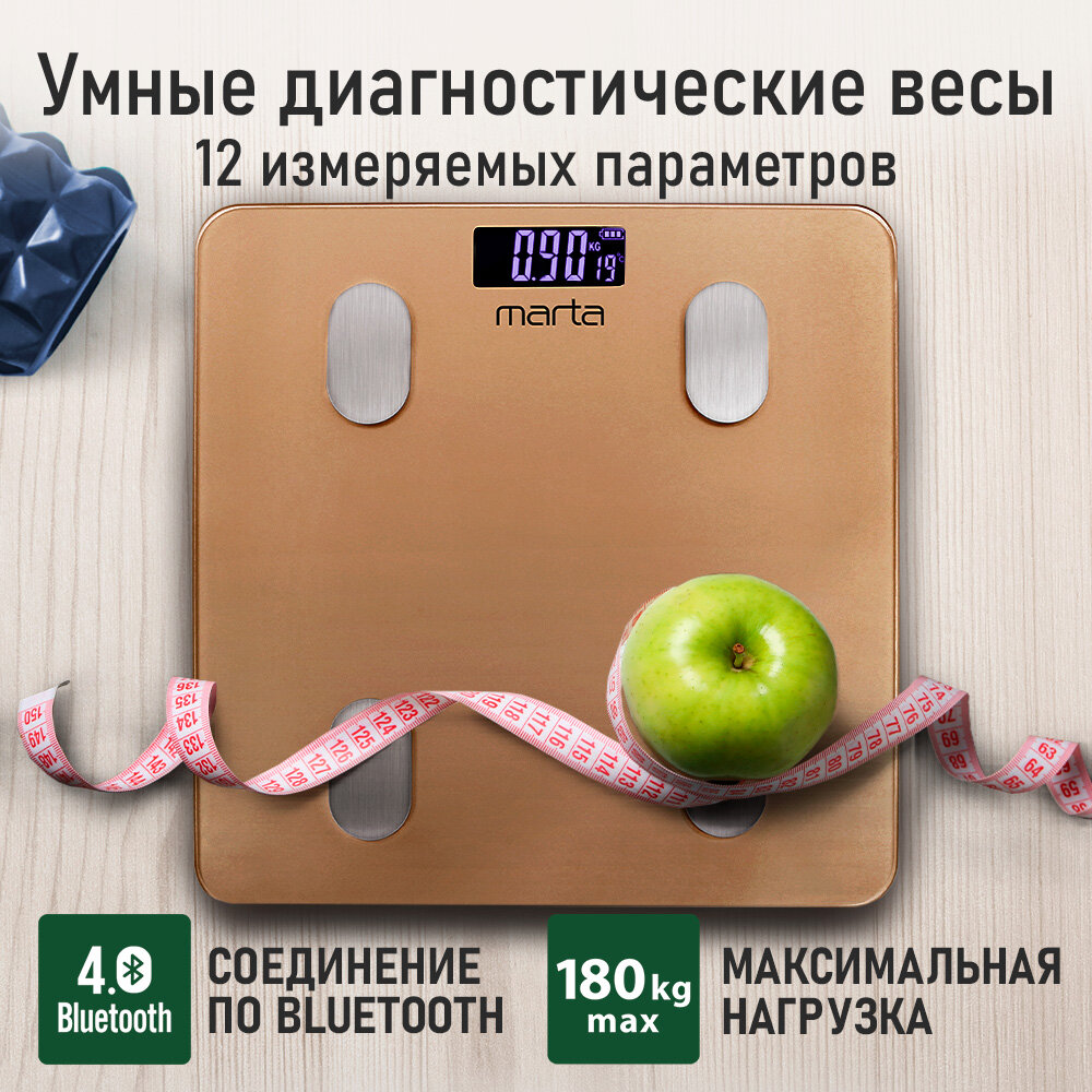 MARTA MT-1607 золотистый опал LCD весы напольные диагностические, умные с Bluetooth