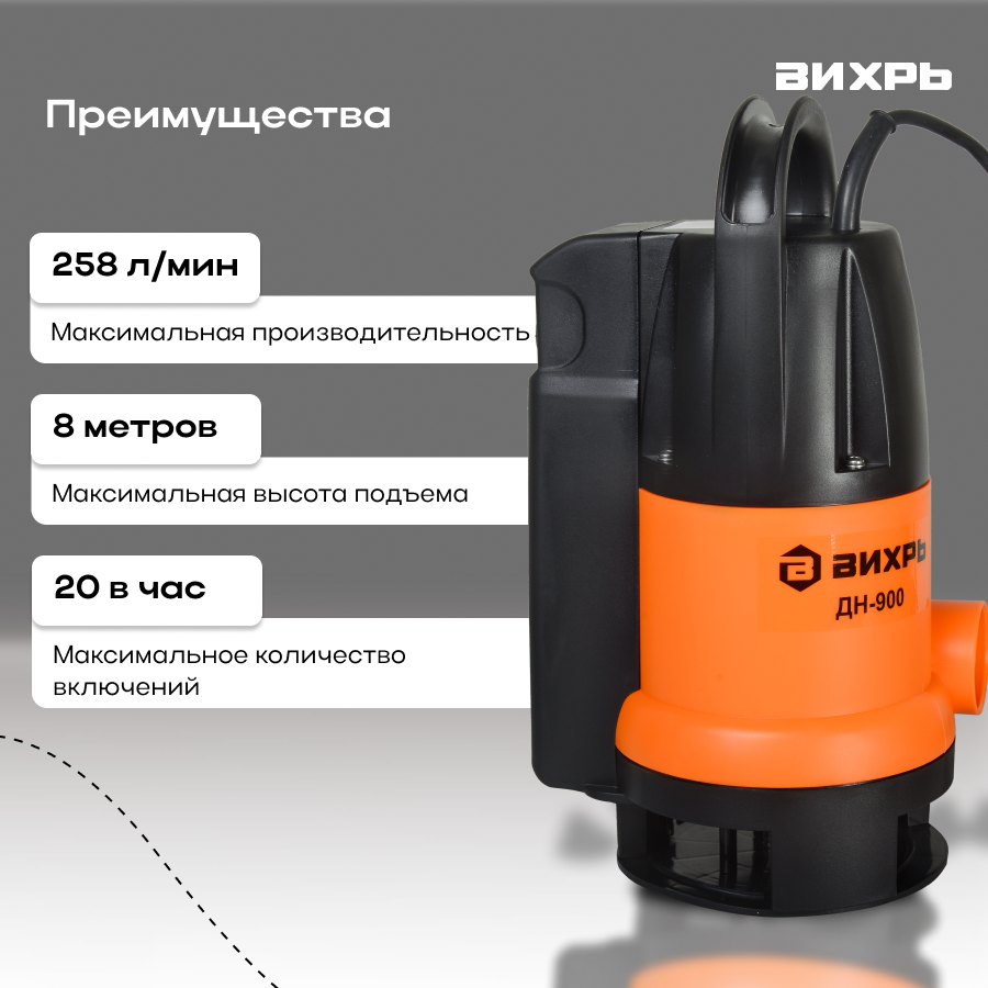 Погружные (дренажные) насосы Дренажный насос вихрь ДН-900, 900 Вт, макс. напор – 8 м, 258 л/мин, для грязной воды