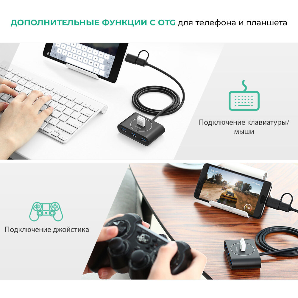 Хаб UGREEN CR113 (40850) USB 3.0 Hub with USB-C Port. Длина 1 м. Цвет: черный