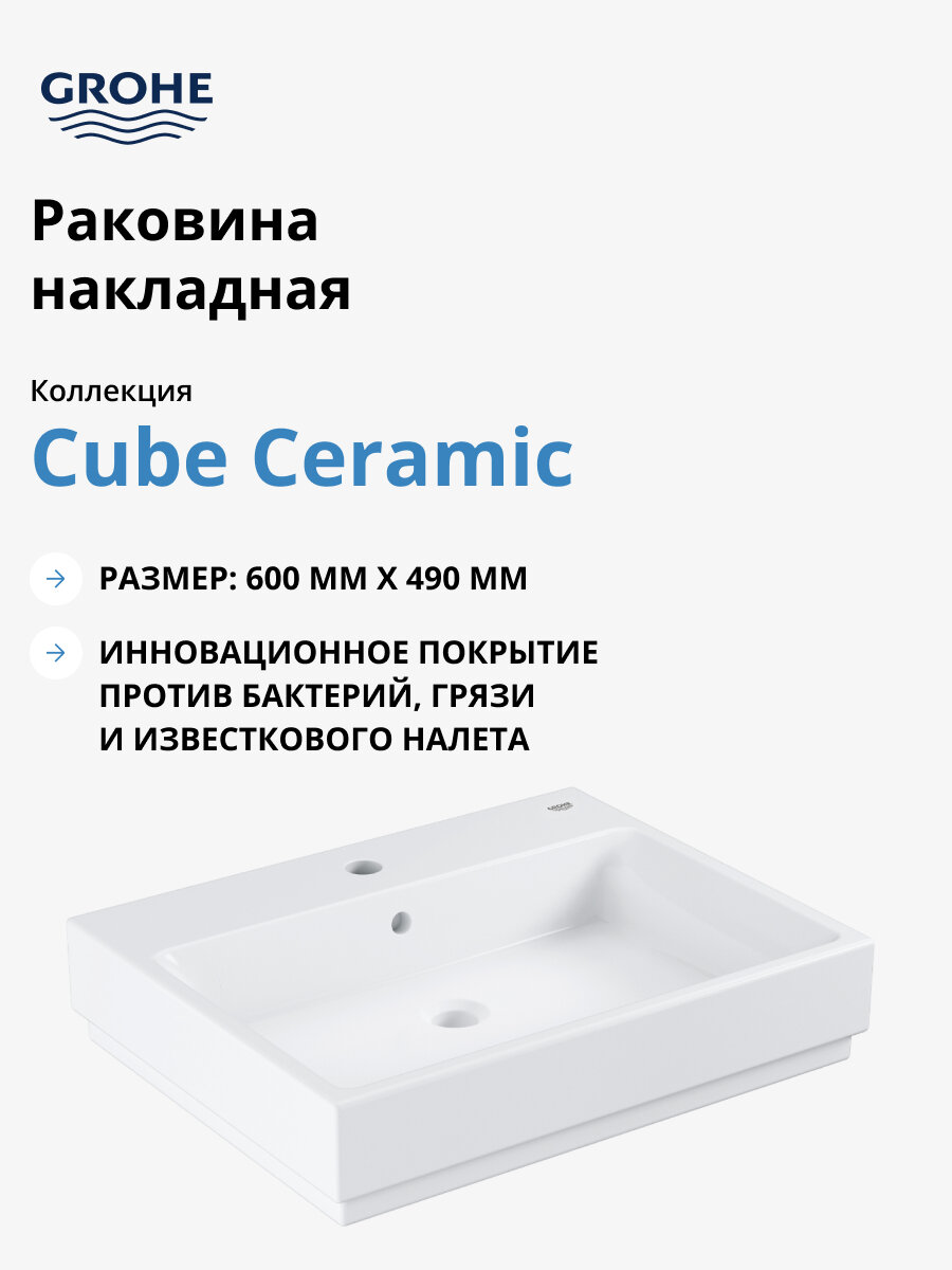 Накладная раковина Grohe Cube Ceramic 60х49х12,5см, арт. 3947700H, санфарфор, с отв. под смеситель