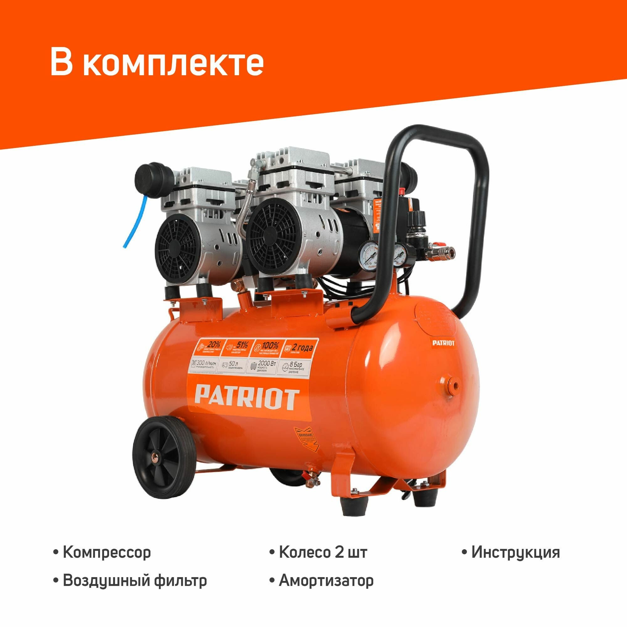 Компрессор Patriot WO 50-300 безмасляный 300л/мин 50л 2000Вт оранжевый