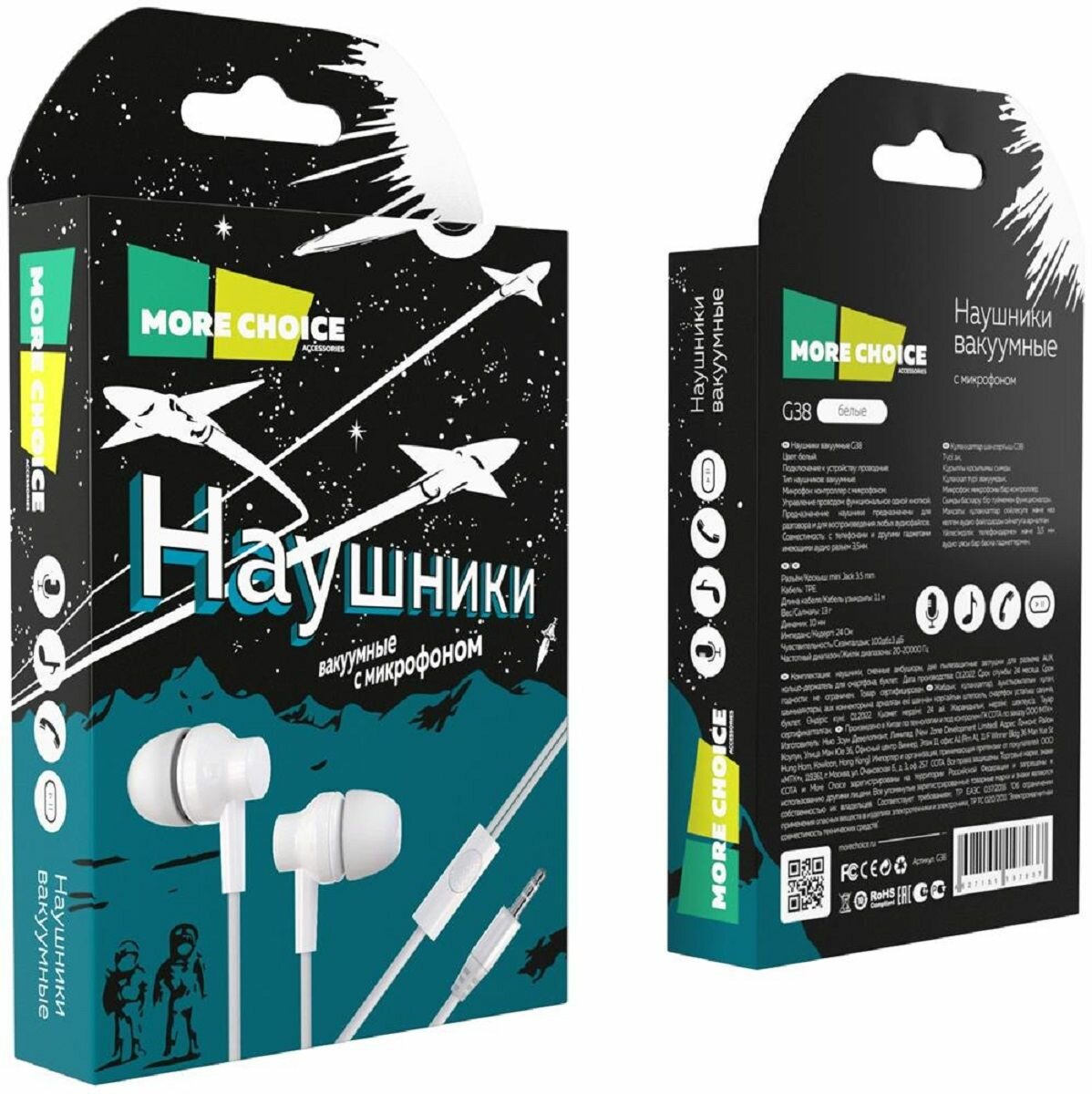 Наушники проводные вакуумные AUX разъём с микрофоном без регулятора громкости длина 1.1м More Choice G38 белые