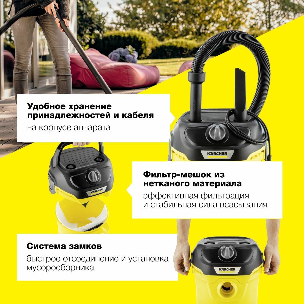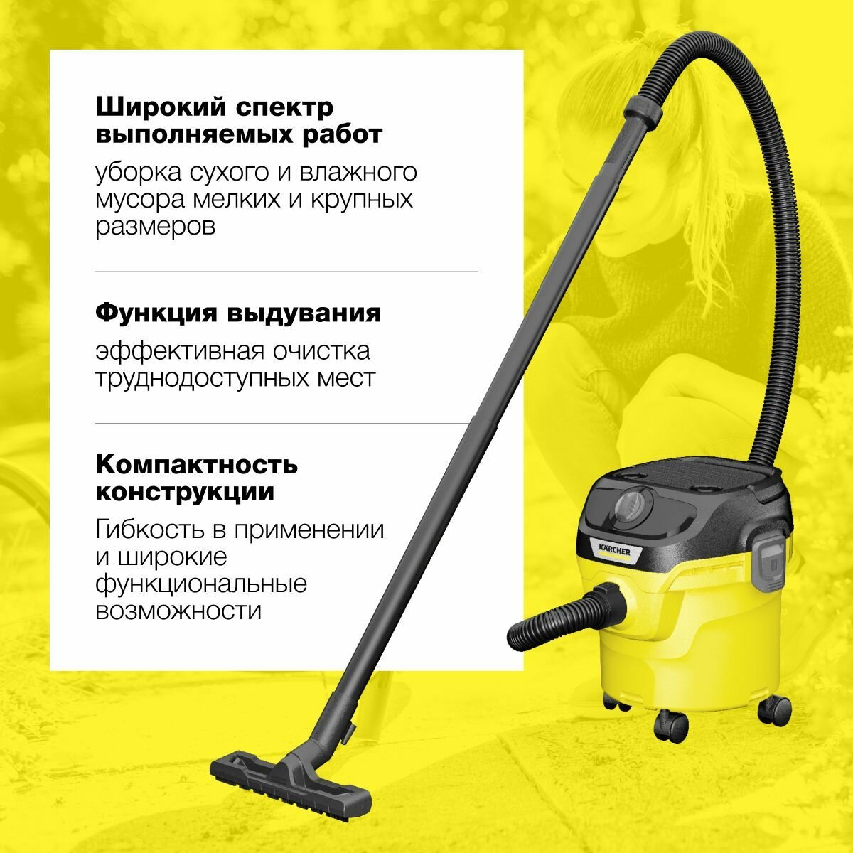 Пылесосы Пылесос для дома Karcher KWD 1 W V-12/2/18 1.628-401.0 сухой и влажной уборки, 1000 Вт, 2 насадки, мусоросборник 12 л, функция выдувания, желтый/черный