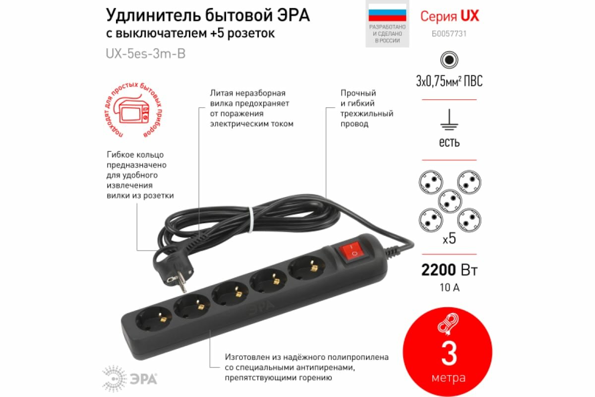 Эра Б0057731 Удлинитель электрический UX-5es-3m-B с заземлением с выключателем 5 розеток 3м ПВС 3x0,75мм2 черный