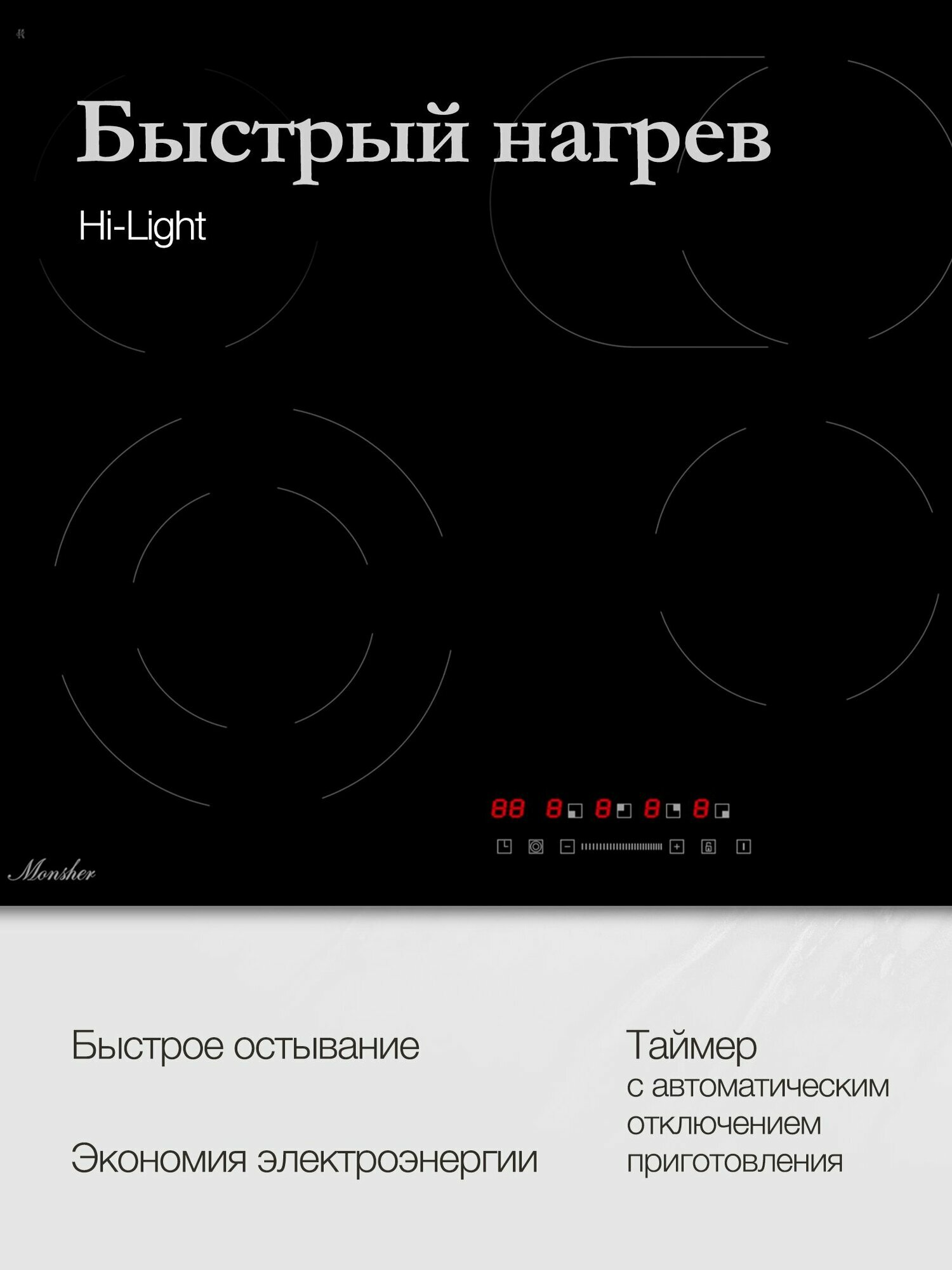 Встраиваемые электрические панели Monsher/ Независимая стеклокерамическая варочная поверхность,Ширина 60 см, 4 зоны ускоренного нагрева,Электронное сенсорное управление,5 цифровых дисплеев, 9 уровней мощности, 1 двойная зона нагрева, таймер, индикаторы ос