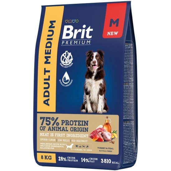 Корм для собак Корм сухой Brit Premium Dog Adult Medium для взрослых собак средних пород 10–25 кг, с индейкой и телятиной 8 кг