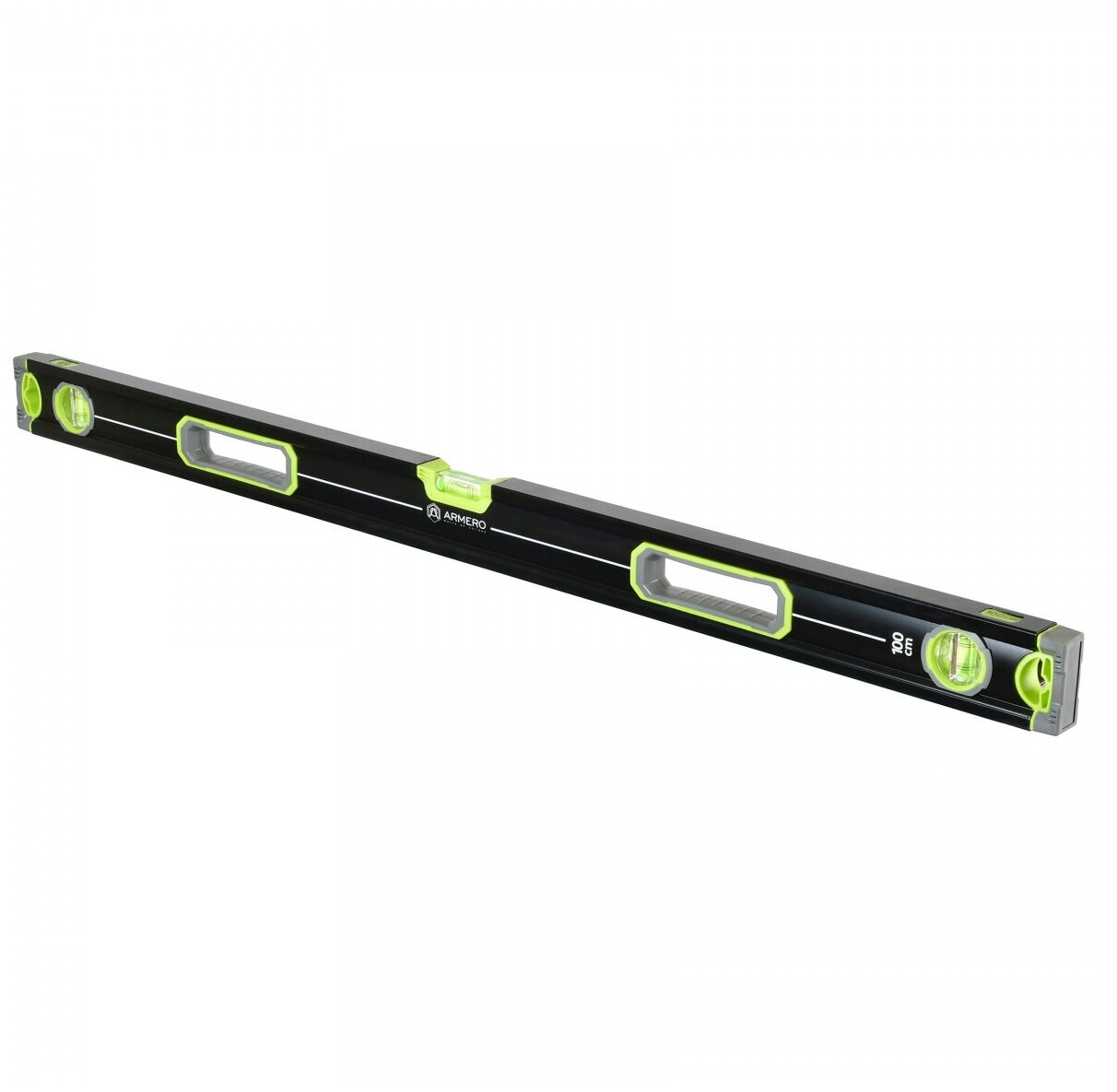 Лучшие цены. Строительный уровень ARMERO с корпусом из алюминия коробчатого сечения имеет 2 фрезерованных поверхности из которых одна намагниченная, 3 глазка: горизонтальный и два вертикальных. На корпусе предусмотрены две рукоятки, отверстия для подвешивания и хранения, имеются резиновые заглушки на торцах для защиты от падения. Имеет точность порядка +/- 0,5 мм/м. Магазины в вашем городе.