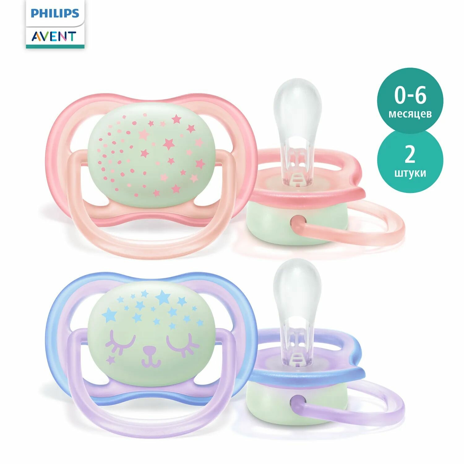 Philips Avent Пустышка ultra air ночная 0–6 мес 2 шт розовая и сиреневая арт. SCF376/12